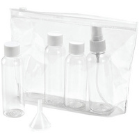 Набор из четырех емкостей для компактной перевозки косметики.два флакона 65 млфлакон 60 млспрей-дозатор 80 млворонка
