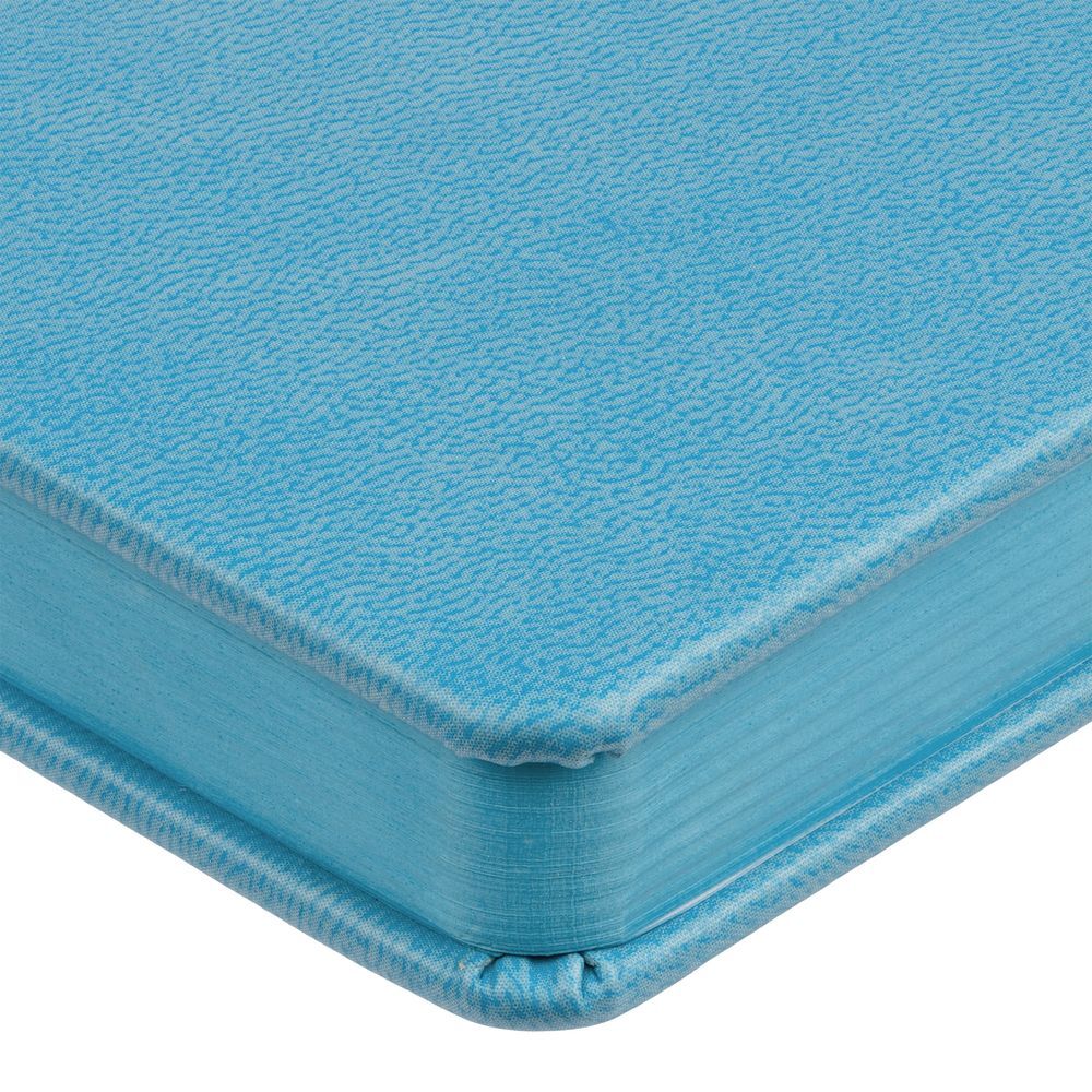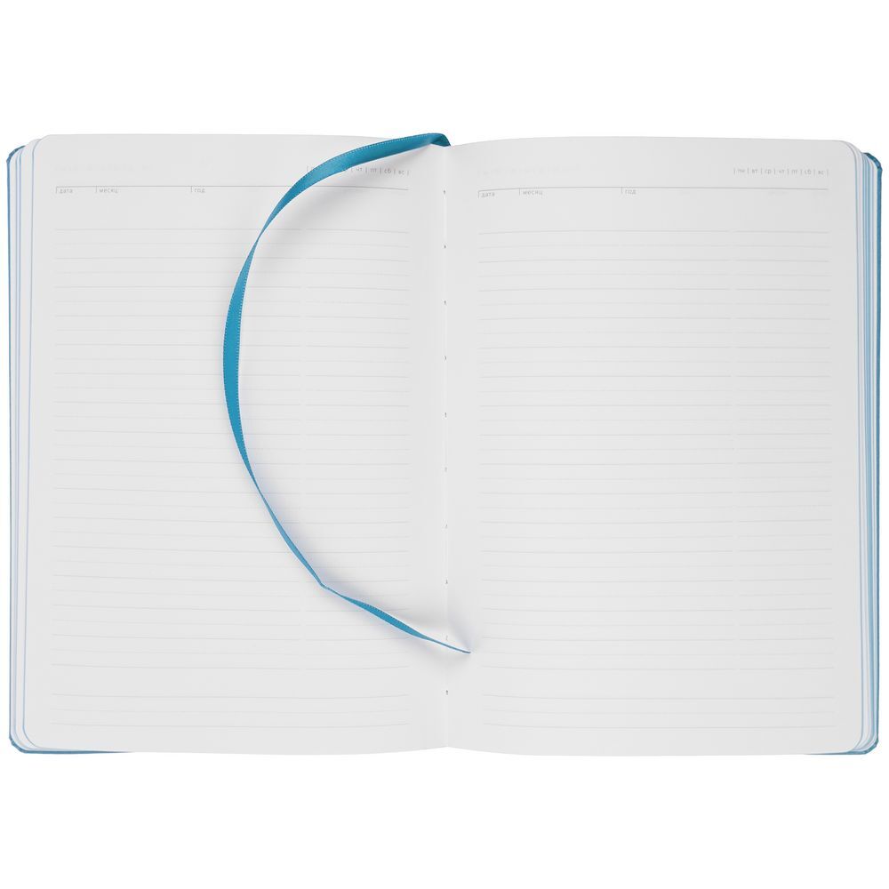 Ежедневник с твердой обложкой и тонированным обрезом. Выполнен из материала Latte, голубой, дополнен ляссе в цвет обложки.Блок недатированный, без календарной сетки:Кол-во страниц — 256;Бумага — белая, плотность 70 г/м²;Форзац и нахзац — белого цвета.