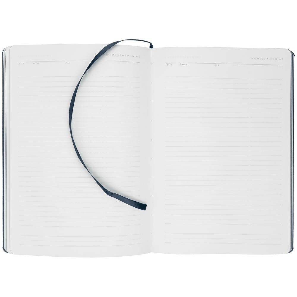 Ежедневник с твердой обложкой и тонированным обрезом. Выполнен из материала Latte, темно-синий, дополнен ляссе в цвет обложки.Блок недатированный, без календарной сетки:Кол-во страниц — 256;Бумага — белая, плотность 70 г/м²;Форзац и нахзац — белого цвета.