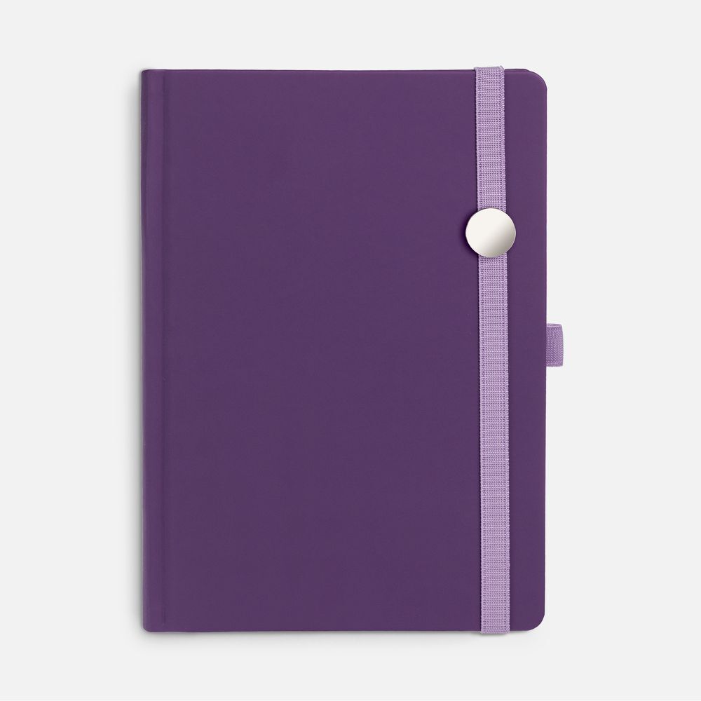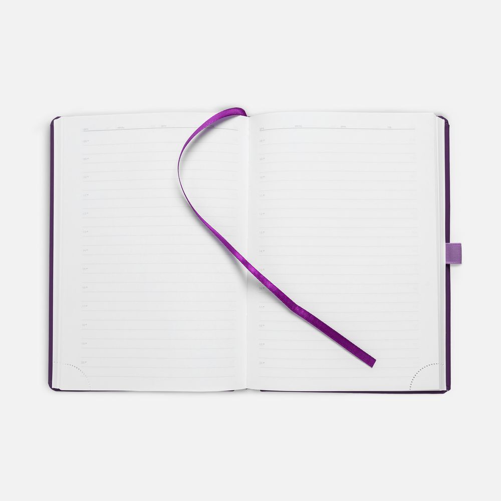 Ежедневник с твердой обложкой без поролона, выполнен из материала Soft Touch, фиолетовый UU, дополнен резинкой шириной 1 см, петлей-резинкой для ручки, капталом и ляссе в цвет обложки.Блок 922, с информационным блоком:Кол-во страниц — 336;Бумага — белая, плотность 70 г/м²;Форзац и нахзац — белого цвета.