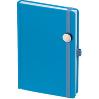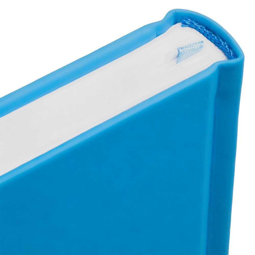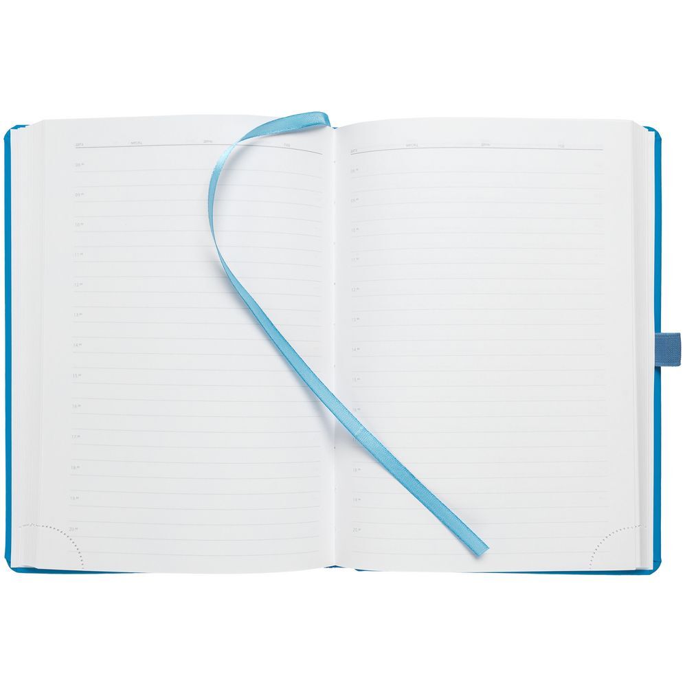 Ежедневник с твердой обложкой без поролона, выполнен из материала Soft Touch Ultra, голубой JJ, дополнен резинкой шириной 1 см, петлей-резинкой для ручки, капталом и ляссе голубого цвета.Блок 922, с информационным блоком:Кол-во страниц — 336;Бумага — белая, плотность 70 г/м²;Форзац и нахзац — белого цвета.