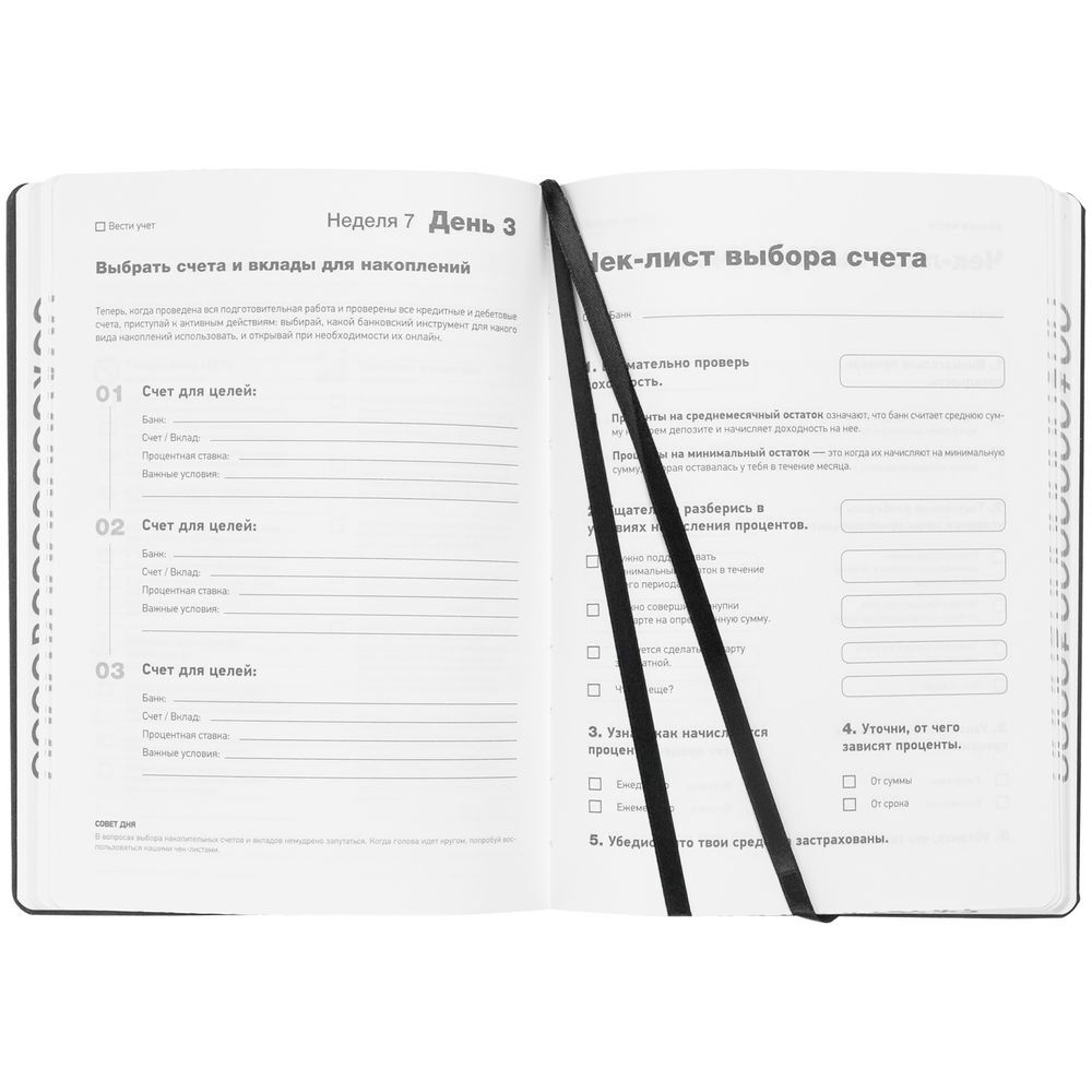 Ежедневник «Финансовая грамотность» поможет навести порядок в личных финансах и построить грамотные отношения с деньгами за 90 дней простых практик. Больше не нужно думать, с чего начать, и волноваться, что что-то было упущено. Каждый день — это шаг к финансовой свободе. Выполняйте интересные задания и развивайте новое экономическое мышление.Ежедневник подскажет, какработать с иллюзиями и ловушками мышления, касающихся денег, чтобы максимально эффективно использовать финансовые инструменты;составить личный финансовый план минимум на 10 лет вперед, чтобы точно знать, над чем работать;определить два новых источника дохода, потому что сейчас стабильность доступна только тем, кто может позволить себе временно потерять занятость;вести учет доходов и расходов, чтобы точно знать, куда уходят деньги, и найти подходящие способы оптимизации расходов;ставить финансовые цели и наращивать запас прочности, чтобы достичь финансовой устойчивости;собрать эффективный страховой портфель, чтобы не пришлось переживать из-за возможных непредвиденных обстоятельств;ориентироваться в финансовой информации, чтобы вовремя реагировать на изменение ситуации.Ежедневник разработан Натальей Аксеновой, специалистом в области финансов.Обложка ежедневника выполнена из материала Nubuck.Индивидуальный блок, 256 стр., бумага белая.