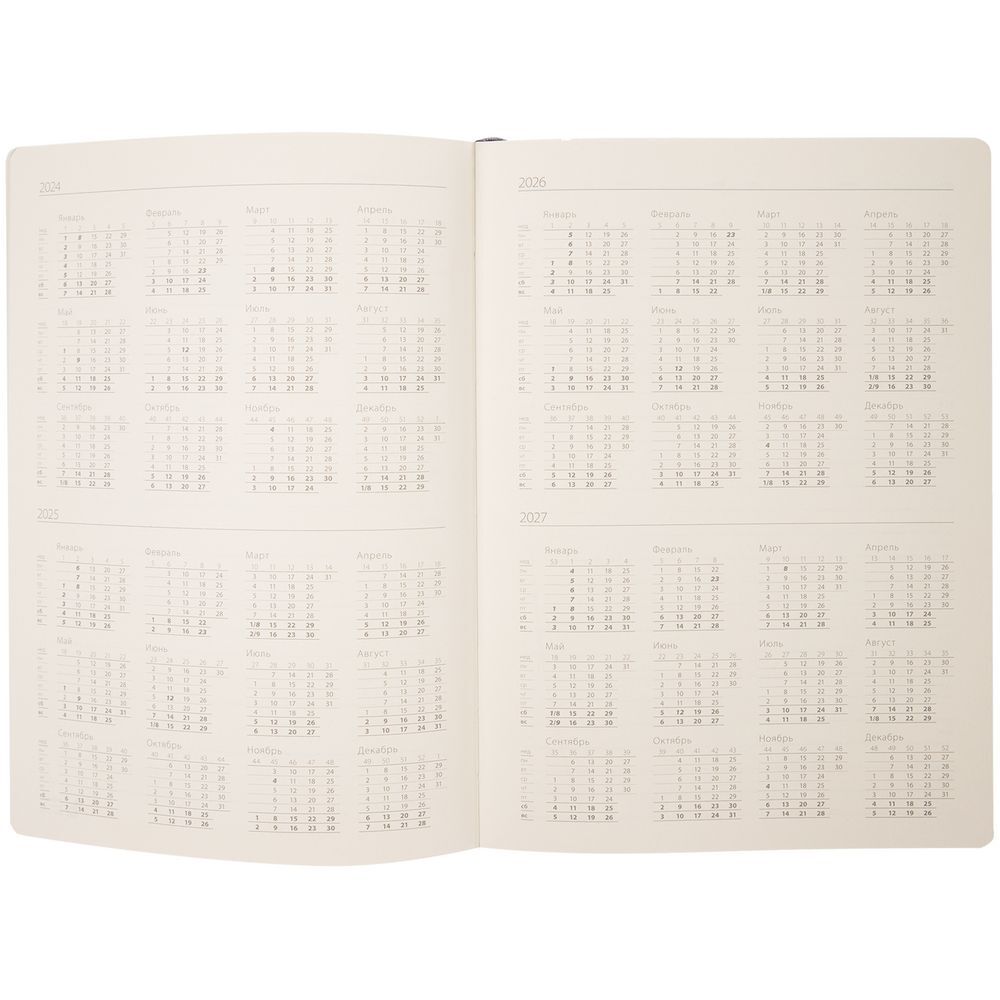 Гибкая обложка ежедневника выполнена из материала Soft Touch Pearl, черный АА и цветного Latte (внутренняя часть обложки).Внутри корешка — специальное место для крепления ручки размером до 15х0,9 см.Блок 986, без информационного блока:Кол-во страниц — 256;Бумага — тонированная, плотность 80 г/м²;Обрез блока — цветной;Форзац и нахзац — цветные.