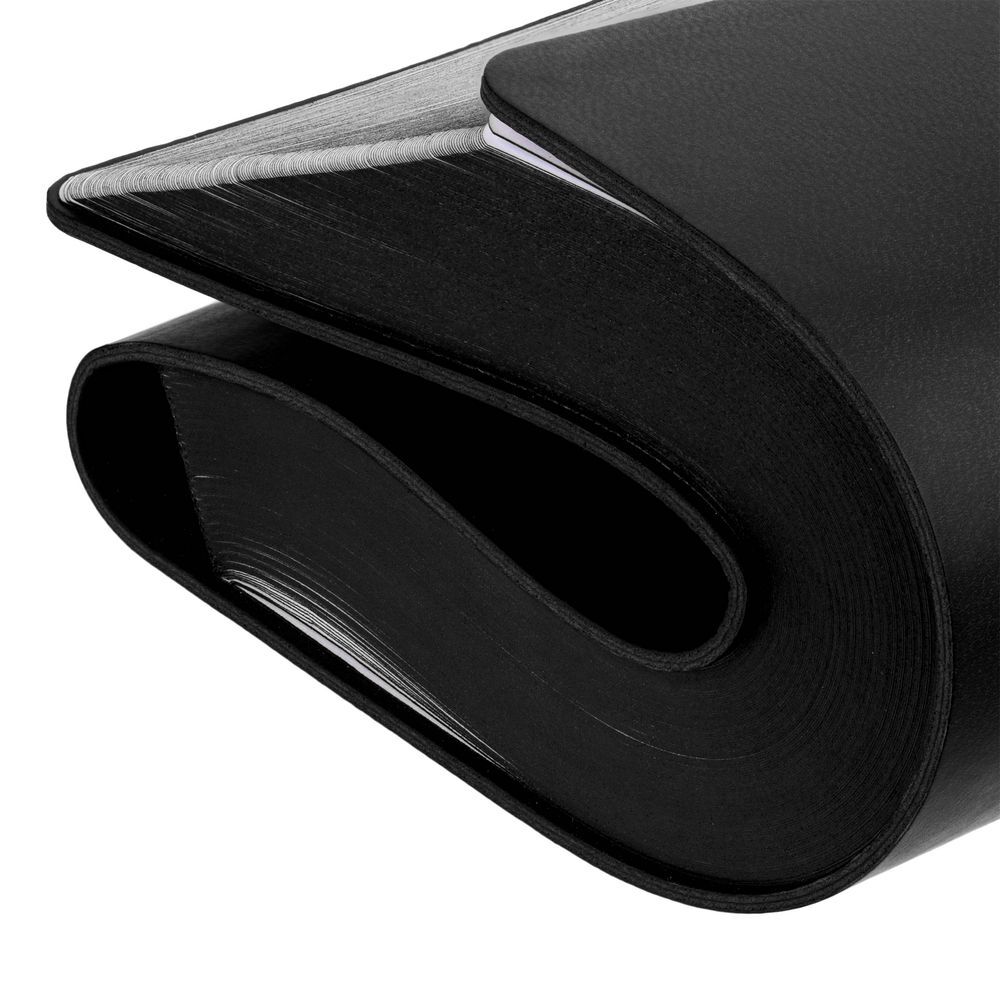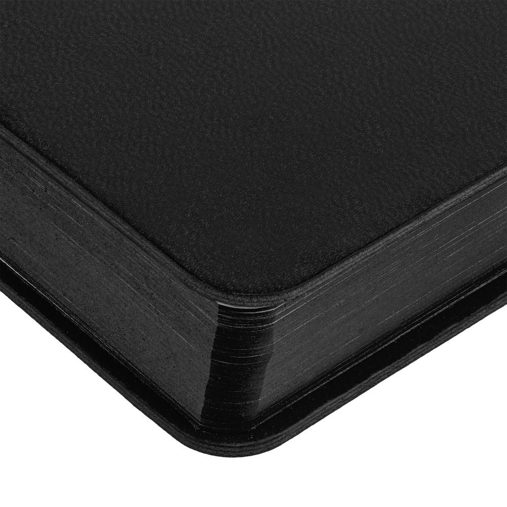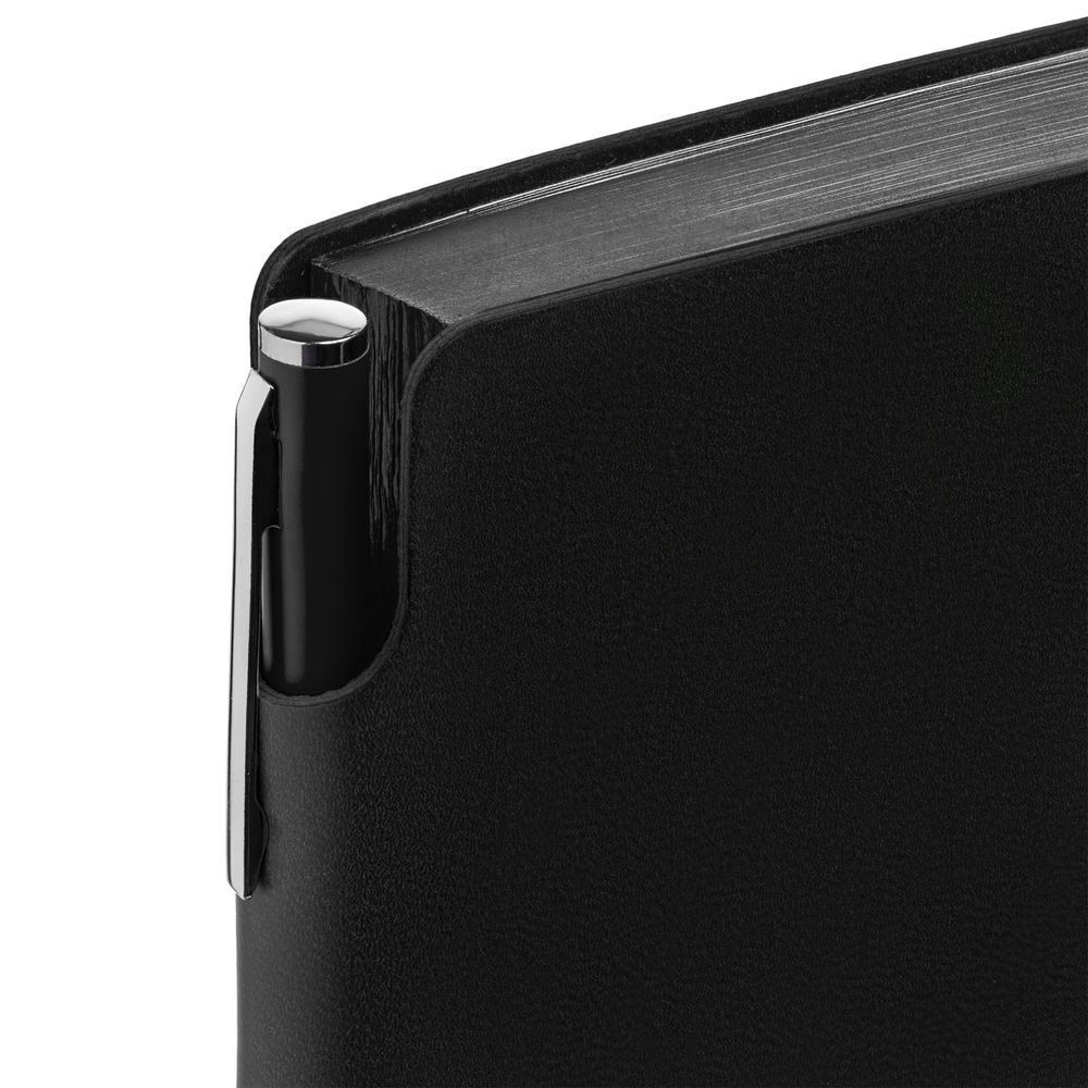 Гибкая обложка ежедневника выполнена из материала Latte, черный АА. Внутри корешка — специальное место для крепления ручки размером до 15х0,9 см.Блок 207, датирован на 2026 год, с информационным блоком: Кол-во страниц — 320;Бумага — белая, плотность 70 г/м²;Форзац и нахзац — белого цвета.