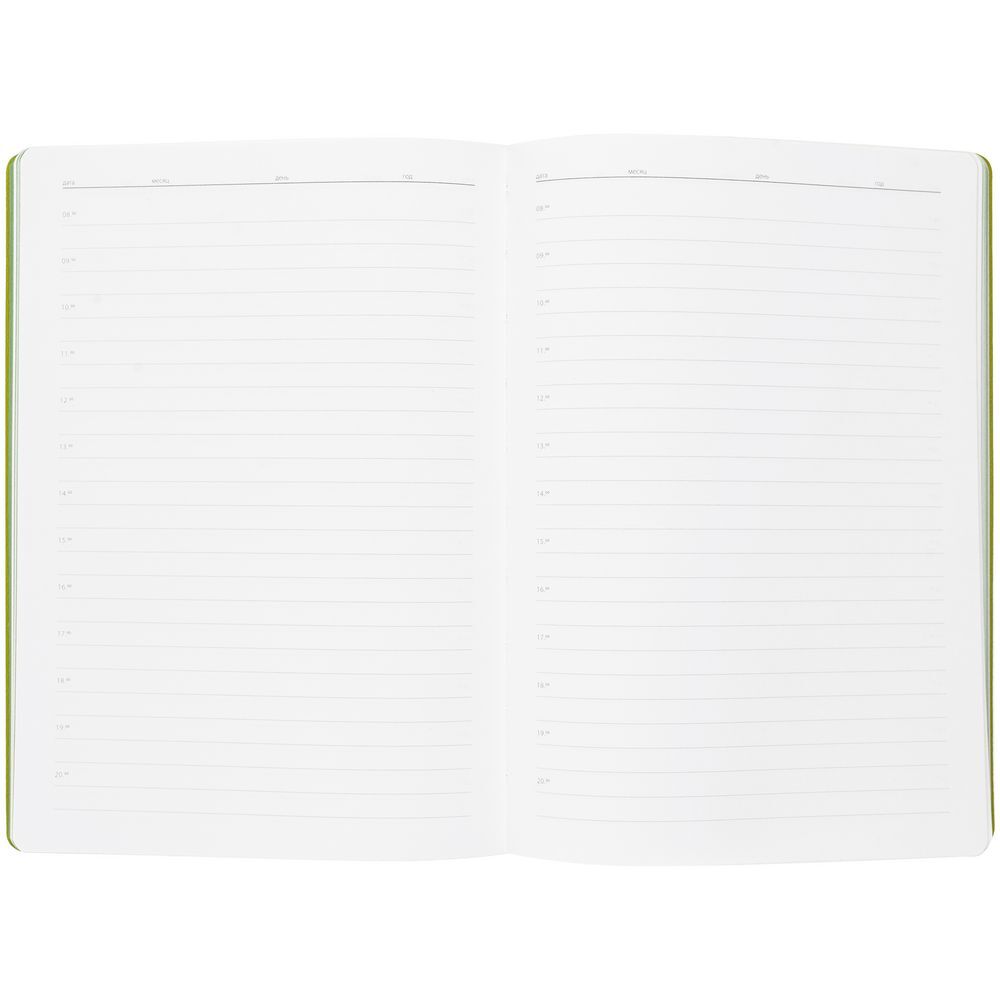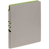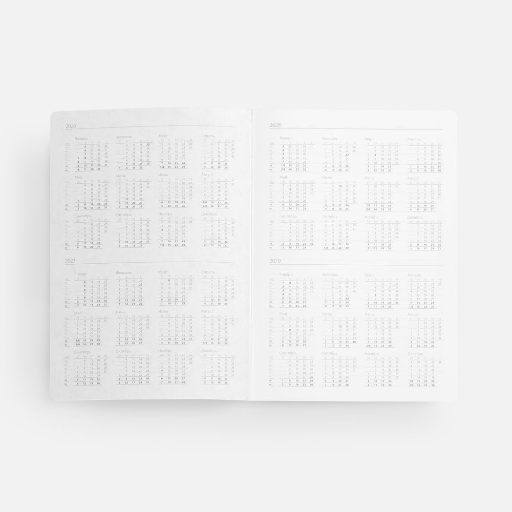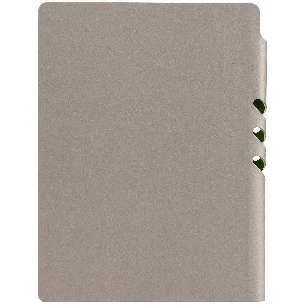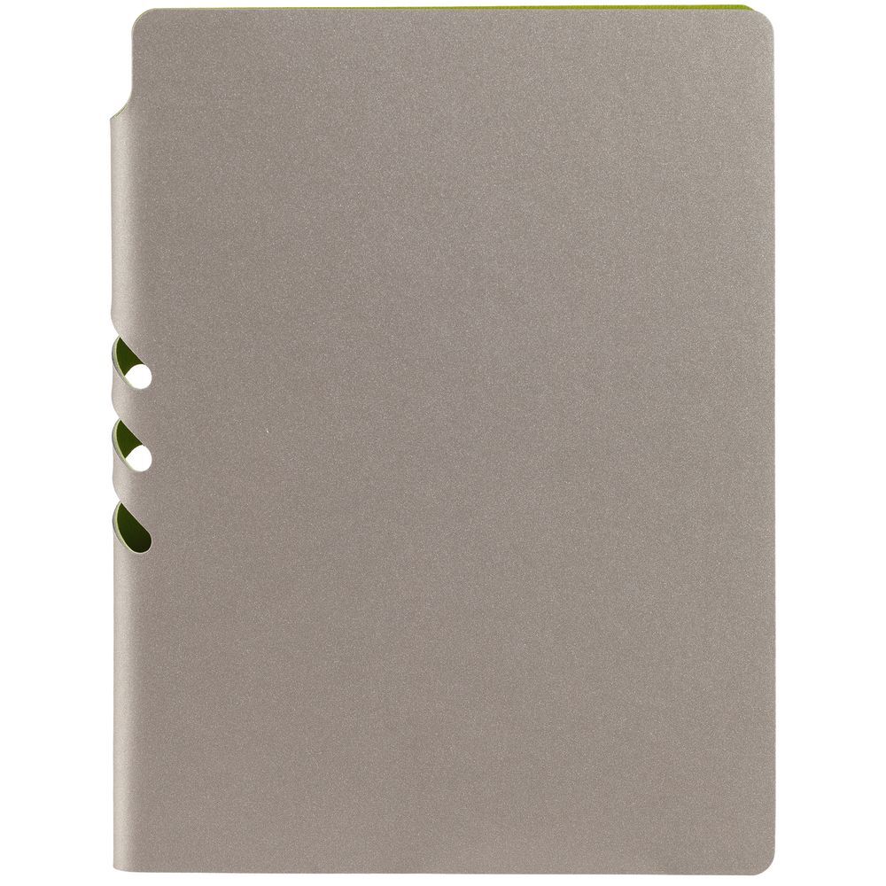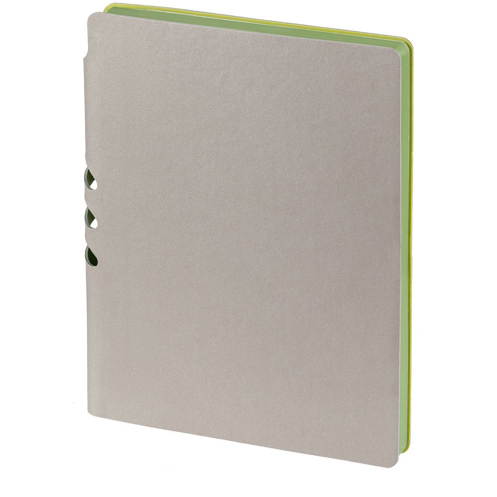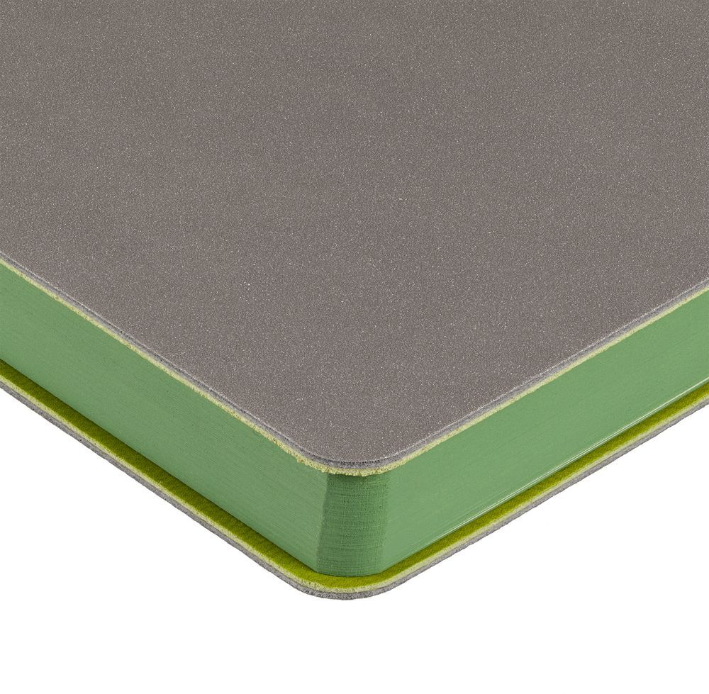 Гибкая обложка выполнена из материала Velour Melange, серый СС и Latte, светло-зеленый (внутренняя часть обложки). Внутри корешка — специальное место для крепления ручки размером до 15х0,9 см.Блок 985, без информационного блока:Кол-во страниц — 256;Бумага — белая, плотность 70 г/м²;Обрез блока — цветной;Форзац и нахзац — белые.