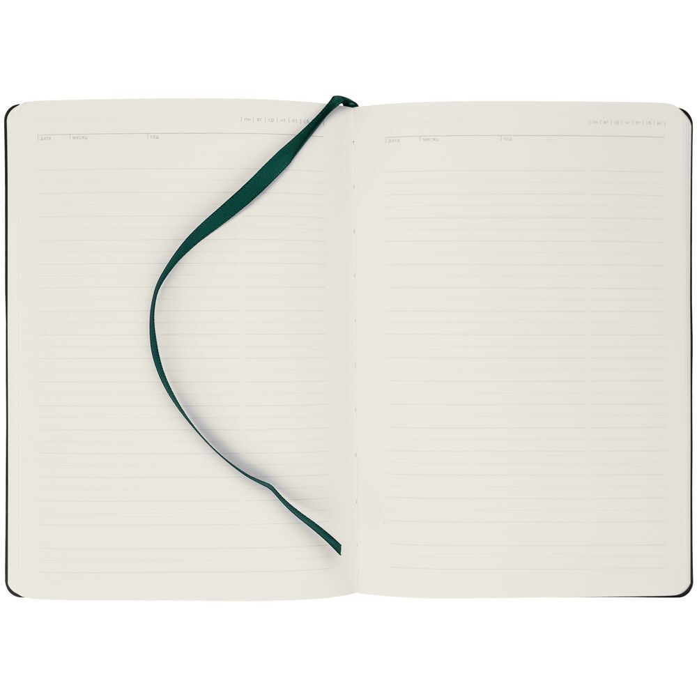 Ежедневник с гибкой обложкой, выполнен из материала Latte, зеленый, дополнен ляссе в цвет обложки.Блок недатированный, без календарной сетки:Кол-во страниц — 256;Бумага — тонированная, плотность 70 г/м².
