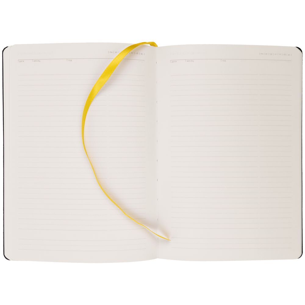 Ежедневник с гибкой обложкой, выполнен из материала Latte, желтый, дополнен ляссе в цвет обложки.Блок недатированный, без календарной сетки:Кол-во страниц — 256;Бумага — тонированная, плотность 70 г/м²;Форзац и нахзац — тонированные.