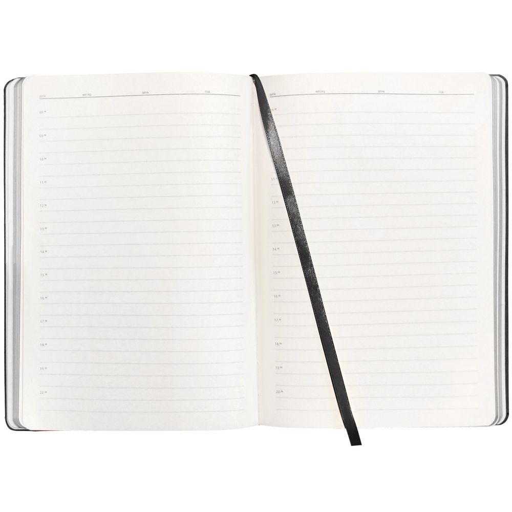 Ежедневник с гибкой обложкой, выполнен из материалов Soft Touch Pearl, черный АА, и Latte, черный (внутренняя часть обложки), дополнен ляссе в цвет обложки с металлическим шильдиком.Блок без календарной сетки и информационного блока:Кол-во страниц — 192;Бумага — тонированная, плотность 80 г/м²;Обрез — черный;Форзац и нахзац — тонированные.