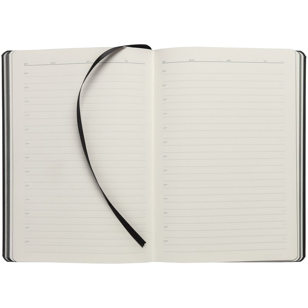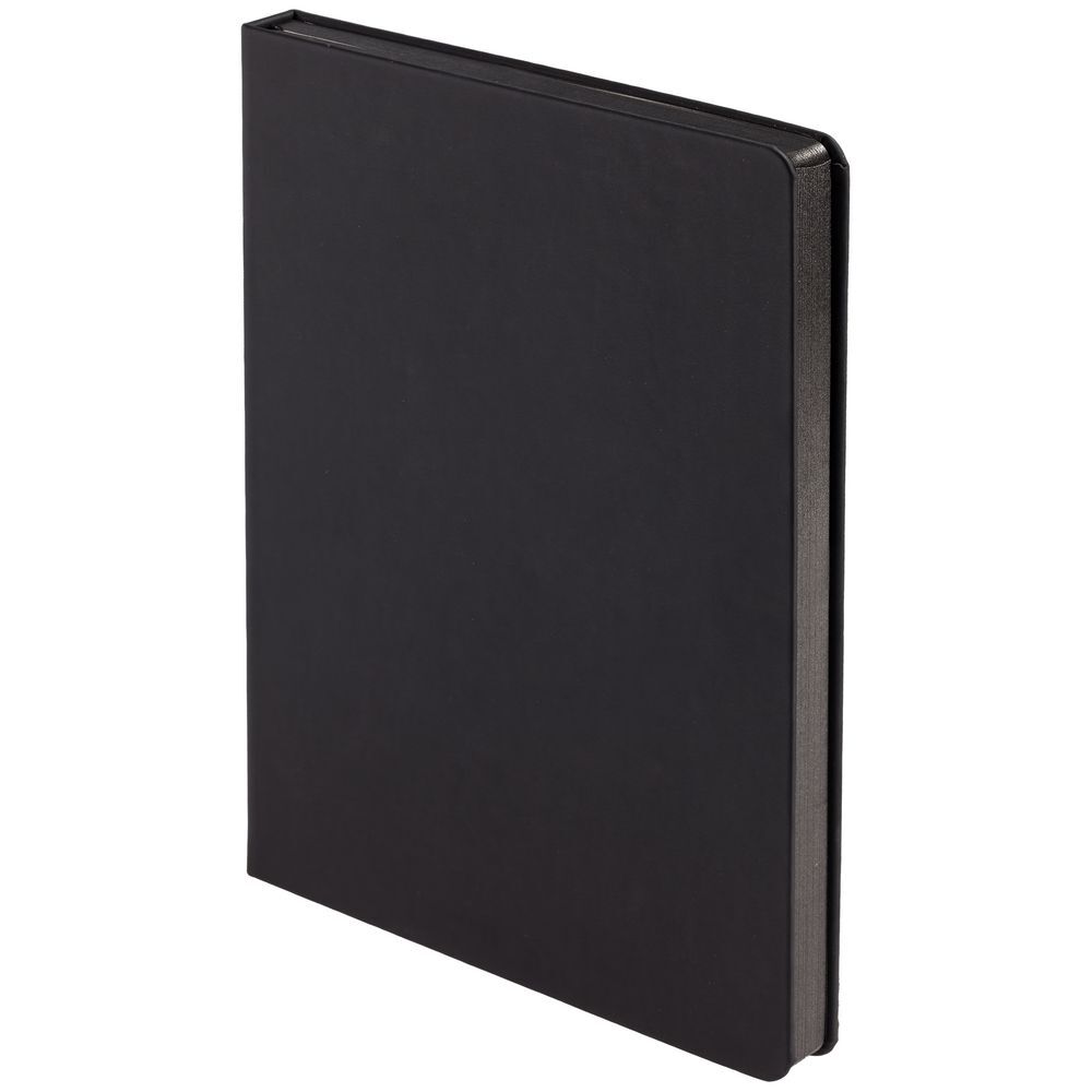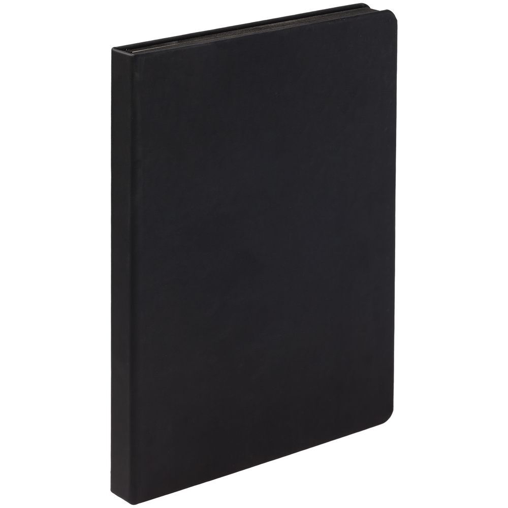 Ежедневник с твердой обложкой и тонированным обрезом, выполнен из материала Soft Touch, черный АА, дополнен ляссе в цвет обложки.Блок 986, без календарной сетки и информационного блока:Кол-во страниц — 256;Бумага — тонированная, плотность 70 г/м²;Форзац и нахзац — черного цвета.