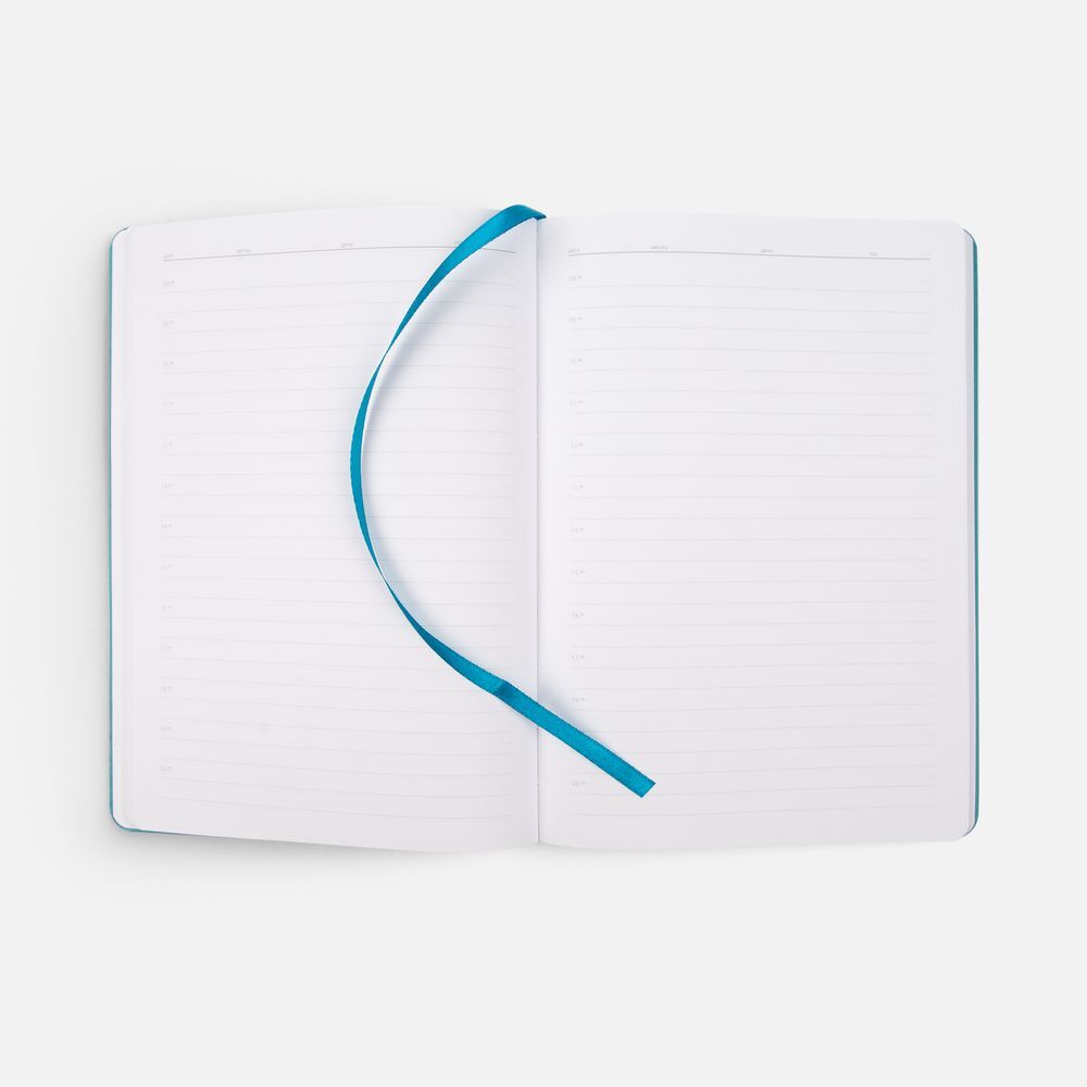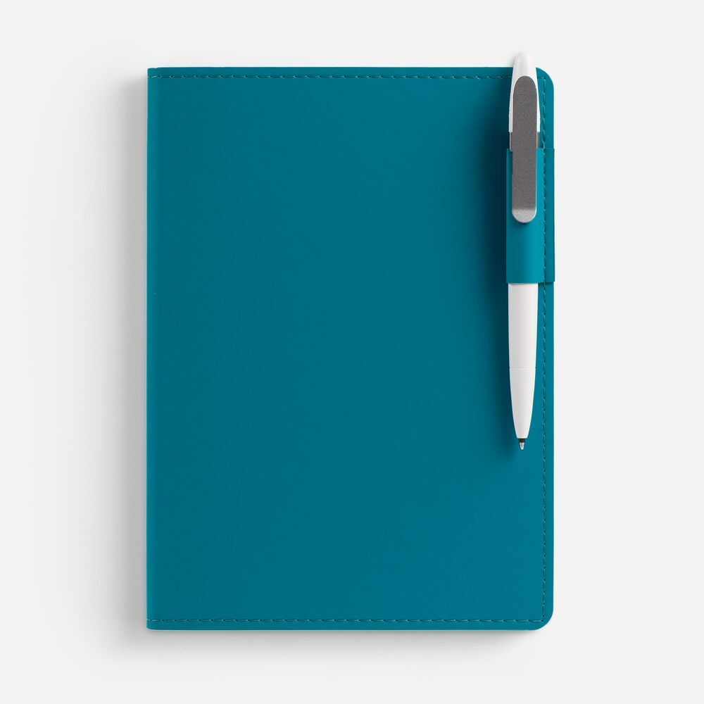 Ежедневник с гибкой обложкой из материала Soft Touch, цвет морской волны II и Latte, морская волна (внутренний материал), дополнен петелькой для ручки из покровного материала, капталом, ляссе и закрашенным срезом обложки в цвет материала. Блок 985, без календарной сетки и информационного блока:Кол-во страниц — 256;Бумага — белая, плотность 70 г/м²;Форзац и нахзац — белые.