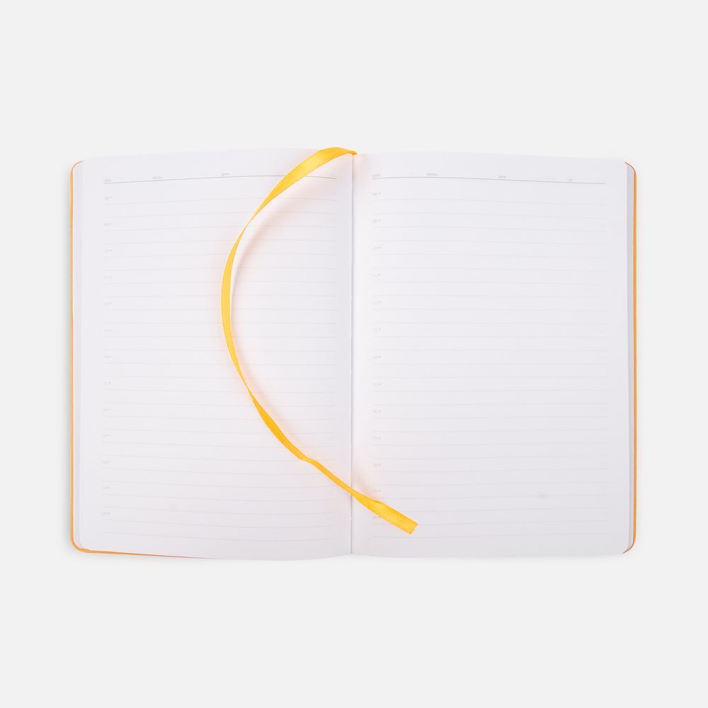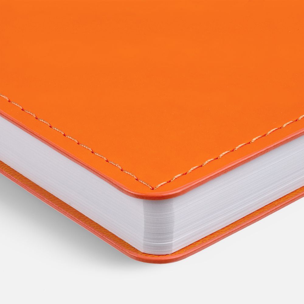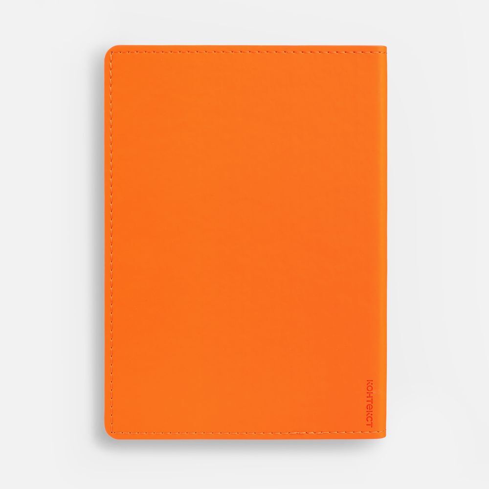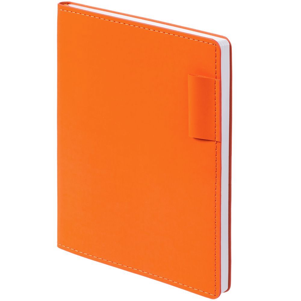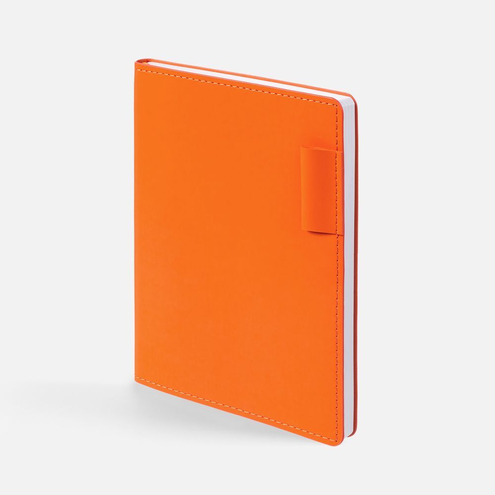 Ежедневник с гибкой обложкой из материала Soft Touch, оранжевый ОО и Latte, оранжевый ОО (внутренний материал), дополнен петелькой для ручки из покровного материала, капталом, ляссе и закрашенным срезом обложки в цвет материала. Блок 985, без календарной сетки и информационного блока:Кол-во страниц — 256;Бумага — белая, плотность 70 г/м²;Форзац и нахзац — белые.