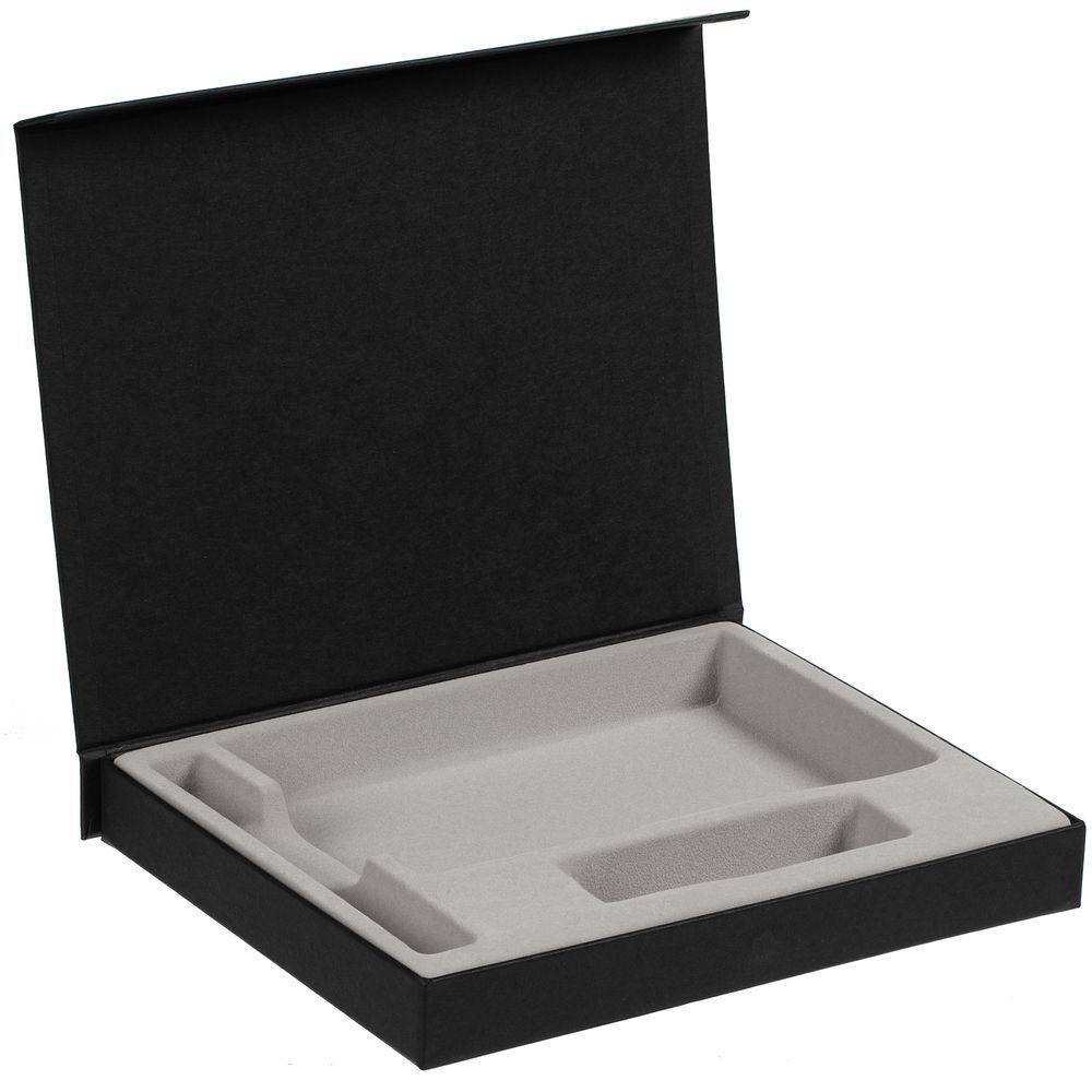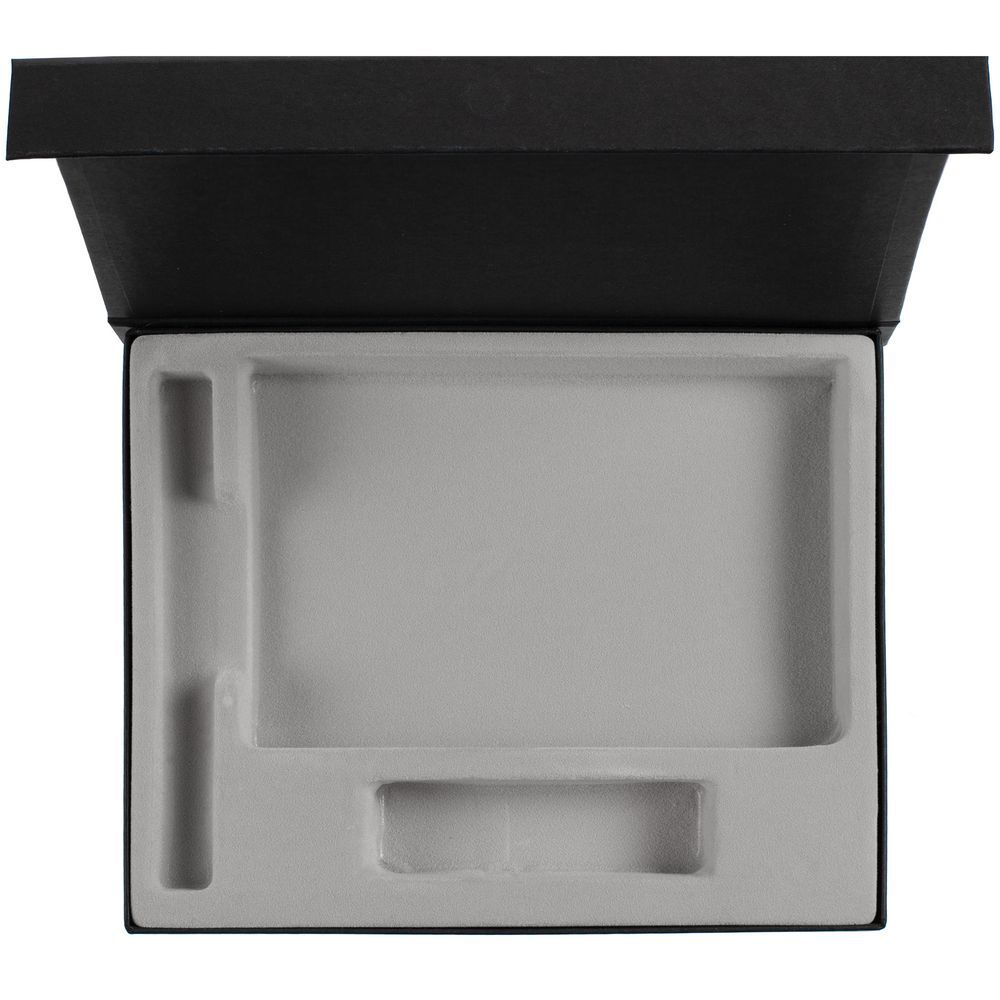 Коробка из переплетного картона, кашированного гладкой дизайнерской бумагой Magic, с крышкой на магните и флокированным ложементом.Подходит для блокнота 10,7х16,5х2 см, аккумулятора 9,5х2,6х2 см и ручки 14,2х1,6 см.