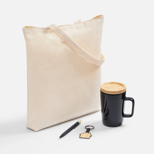 Материалкружка - керамика, крышка - бамбук; сумка - хлопок 100%, плотность 210 г/м²; саржа; брелок - бамбук, металл; ручка - металл, алюминий; кнопка - бамбук