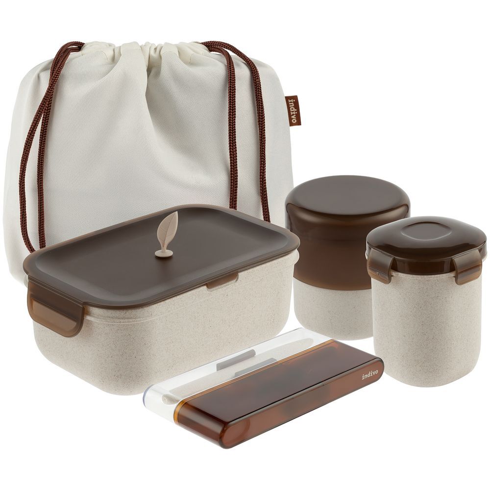 ланчбоксы, приборы - растительные волокна; мешок - пластик, полиэстер; пластик, полипропилен